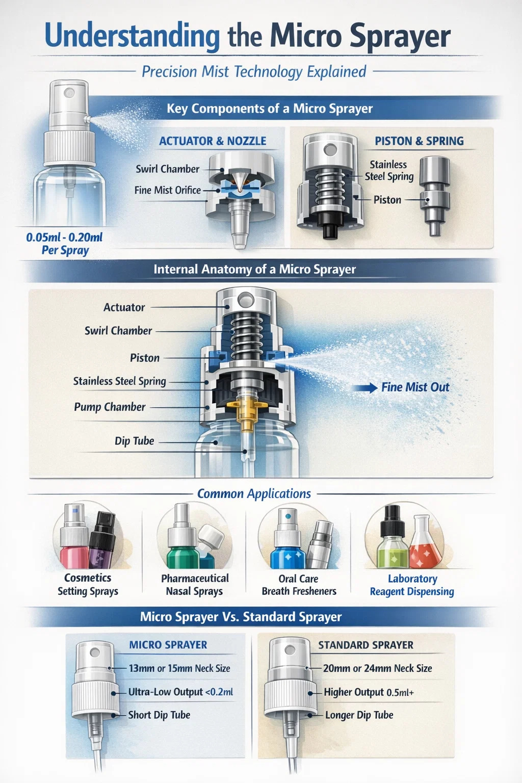 Aby som odpovedal na otázku "Čo je mikrorozprašovač?" , je to precízne skonštruované dávkovacie zariadenie určené na premenu kvapaliny na extrémne jemnú, konzistentnú hmlu s veľmi nízkym výstupným objemom na jeden zdvih. Na rozdiel od štandardných rozprašovačov so spúšťou používaných na čistenie domácností, a mikrorozprašovač zvyčajne medzi 0,05 ml a 0,20 ml produktu naraz, čo z neho robí ideálnu voľbu pre vysokohodnotné tekutiny, kde je kontrola dávkovania a jemná aplikácia prvoradá.