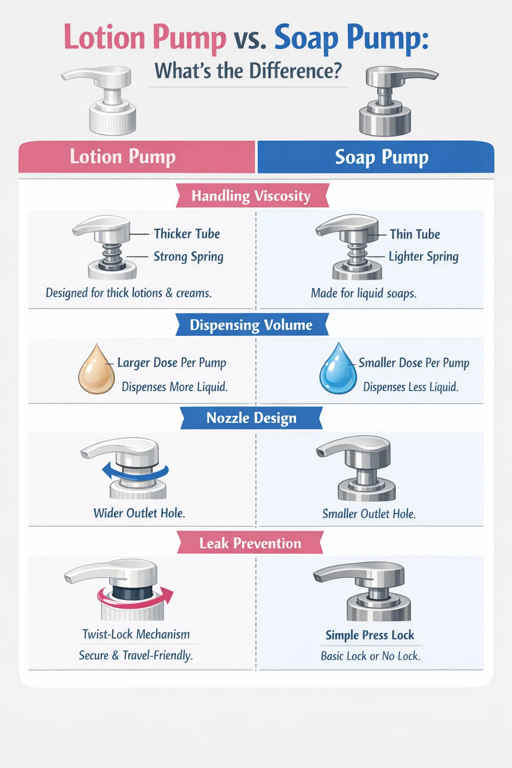 Hoci pumpičky na pleťové vody a mydlové pumpy vyzerajú veľmi podobne a často sa používajú zameniteľne, majú výrazné rozdiely vo svojom vnútornom dizajne a funkčnosti.
